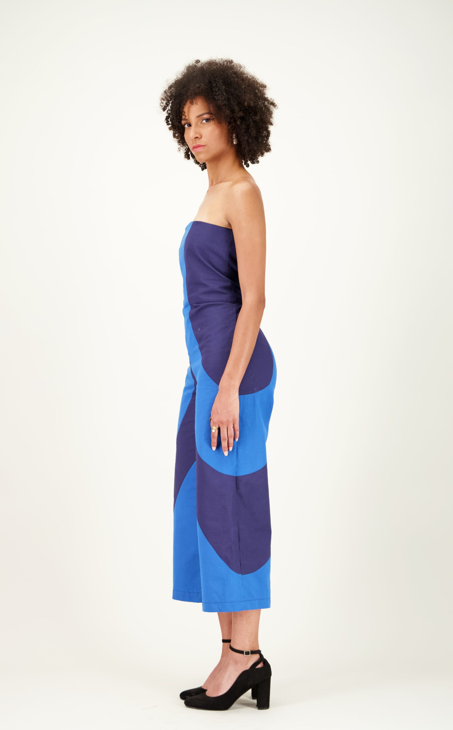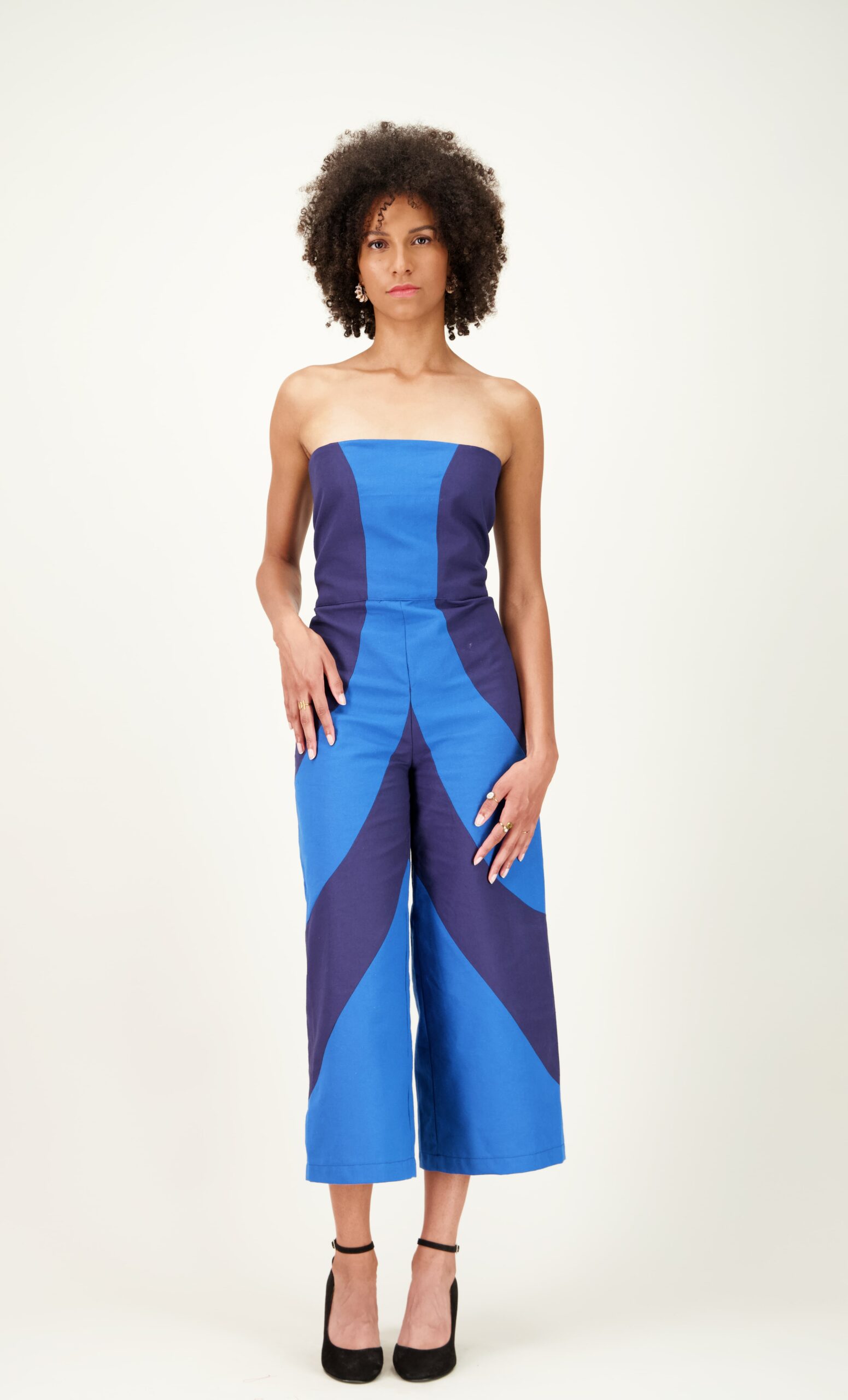 Une combinaison bustier dont le charme repose sur un duo de bleu et une organisation des formes. Une création portée par Justine Go-modèle chez Go-styles.